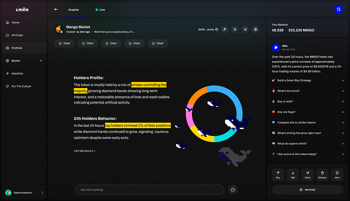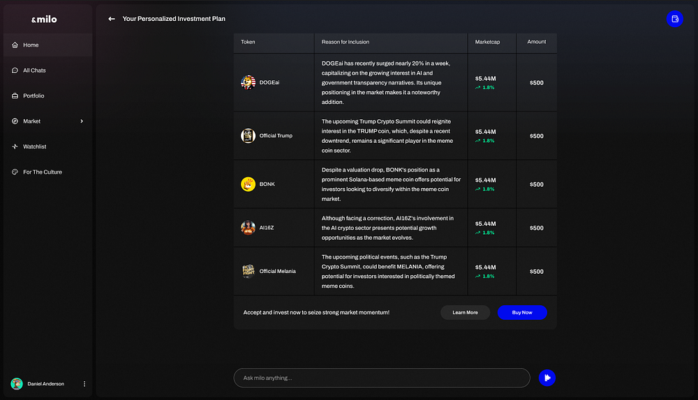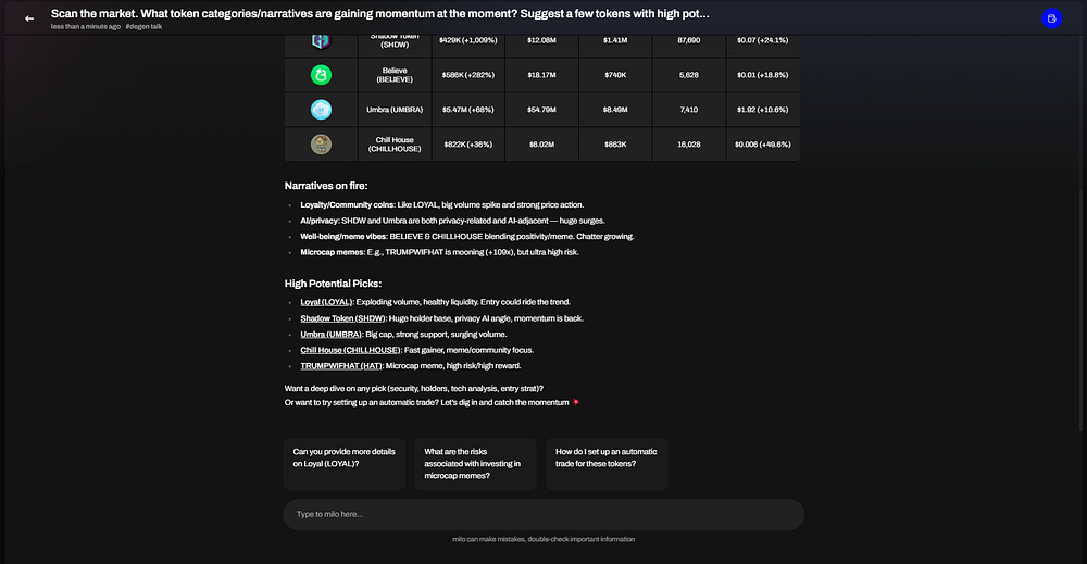 💡 Milo will give you a precise, straightforward answer based on data and facts, perfect if you’re on the fence about some tokens.