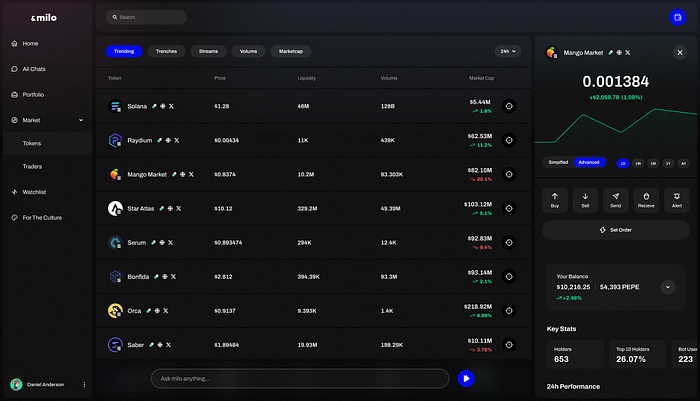 Use Milo to compare token clusters by narrative and alert you when one sector starts showing higher accumulation and stronger liquidity than others.