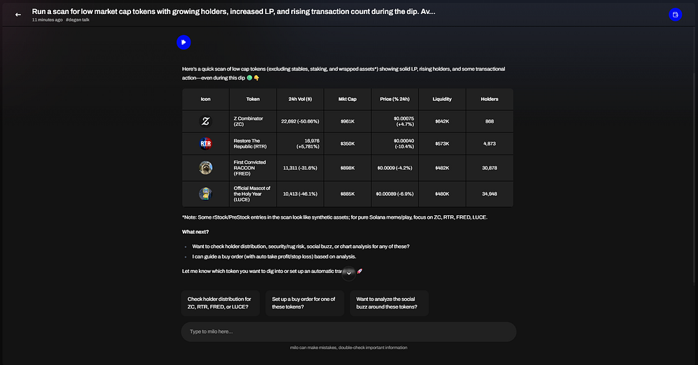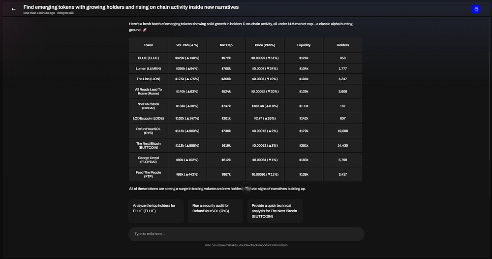 If you’re struggling, you can have Milo surface emerging tokens with growing holders and rising on chain activity inside new narratives before the crowd notices.