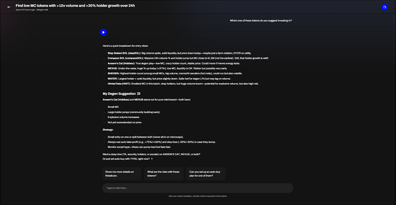 The AI agent I used is called Milo. It’s built on Solana, connects directly to your wallet, and is completely free to use. You can try it here.