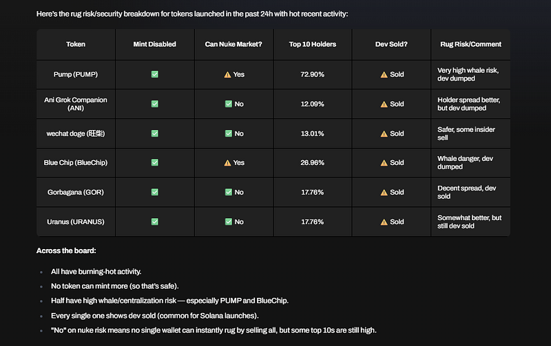 Instead of manually tracking dozens of wallets and scanning new tokens (a process that was exhausting and often too slow), the AI watches continuously and flags anything that looks off.