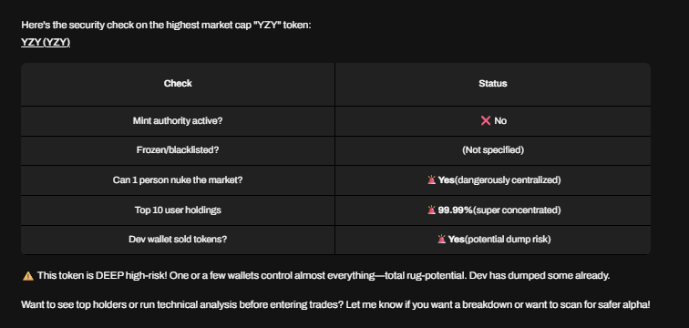 Now, the real benefit is much greater than just avoiding losses (which is already a massive advantage on itself). It’s the confidence that comes with knowing the AI has your back 24/7. I can focus on analyzing tokens, spotting opportunities, and defining the strategy instead of constantly worrying if I’m about to get rugged.