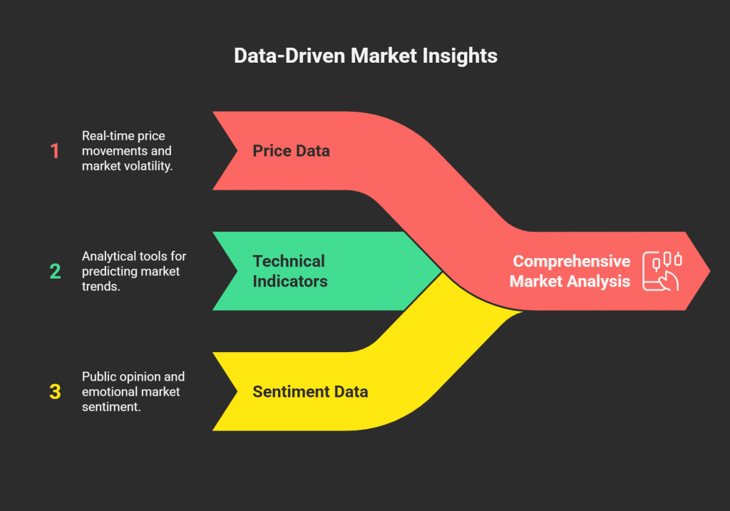 - Sentiment Data: Twitter mentions, Reddit threads, news sentiment, Fear & Greed index.