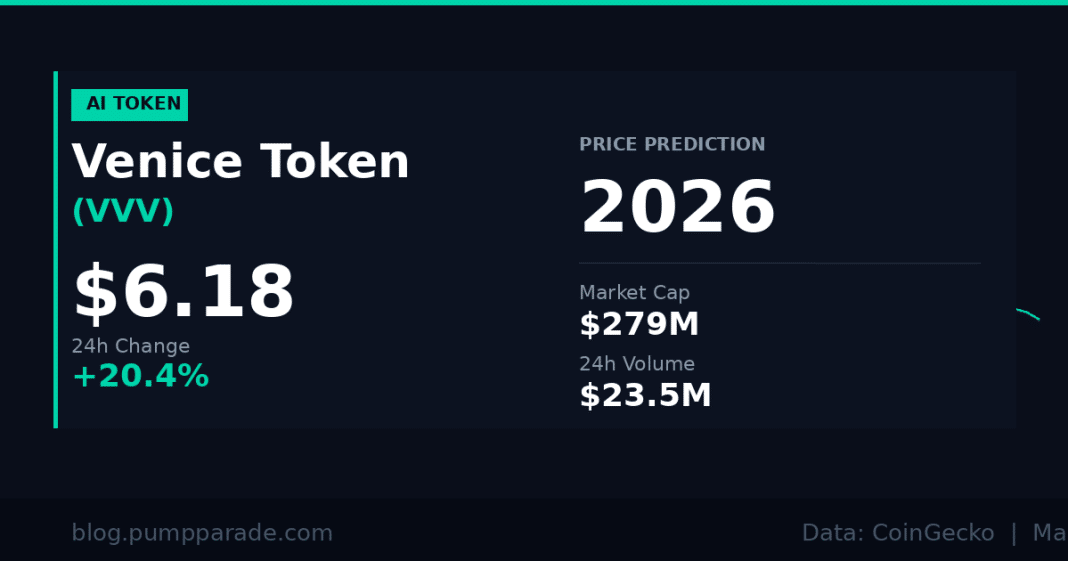 Venice Token VVV price hero image showing current price $6.18 and 24h change March 2026