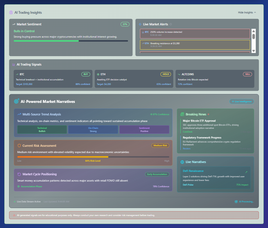 - Use AI-generated crypto trading signals driven by price action, sentiment shifts, and on-chain movement.