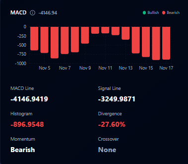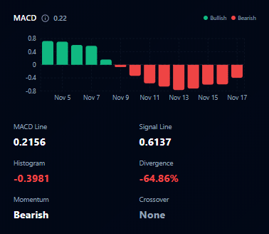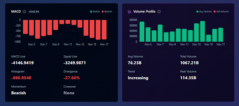 - MACD and Signal Lines: Histogram indicates momentum strength.