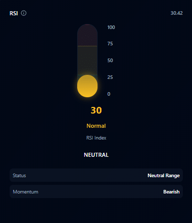 - RSI: Highlighted with color coding: oversold in green (-30), overbought (+70) in red.